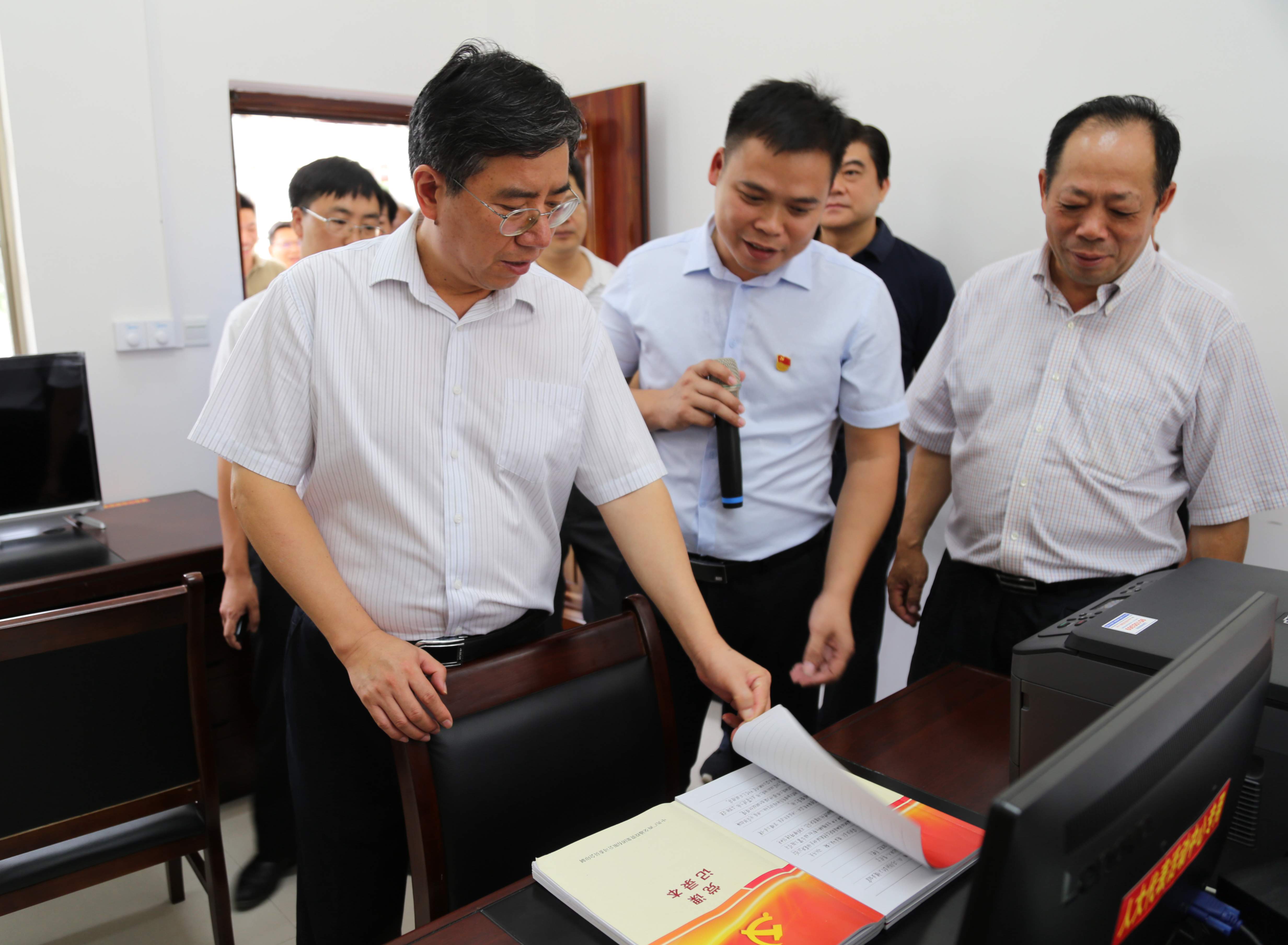 在河洲村第一书记办公室,喻云林部长在翻阅村支部“九簿一册”后,对河洲村党支部结合当地基层党建工作情况,落实集团公司党建“九问工作法”表示肯定,他指出:“广西交通投资集团把最好的支部党建工作经验带到了基层。”