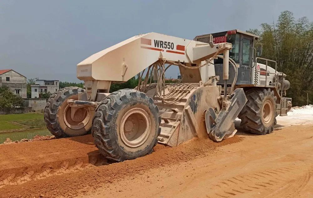 为解决土质问题,荔玉路开展了深入调查研究和试验工作,提出采用掺拌石灰或水泥改良路床土质填料物理特性的方案,即利用撒布机将掺拌材料均匀撒布在静压后的路床上,通过引入先进的路面冷再生机实现土、石灰或水泥的充分拌和,最后用平地机整平后碾压成型。