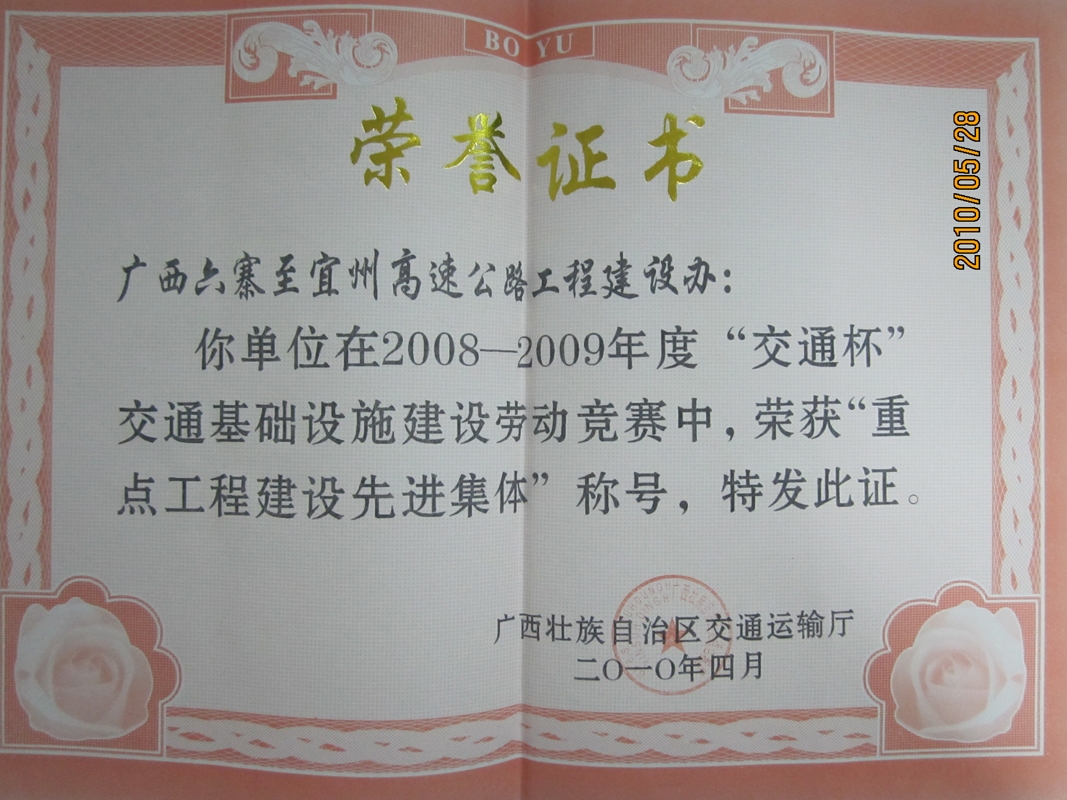 广西六寨至宜州高速公路工程建设办2008-2009年度“交通杯”交通基础设施建设劳动竞赛荣获“重点工程建设先进集体”称号
