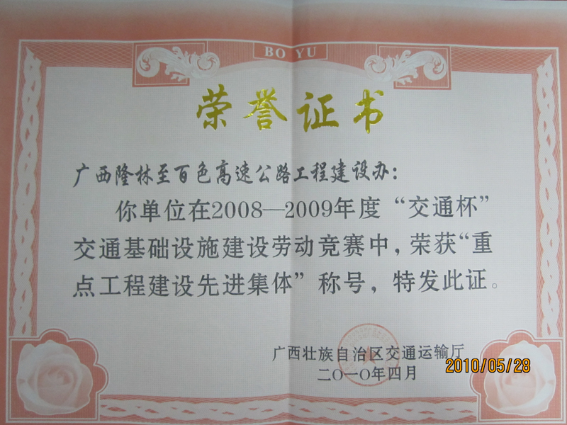 广西隆林至百色高速公路工程建设办2008-2009年度“交通杯”交通基础设施建设劳动竞赛荣获“重点工程建设先进集体”称号