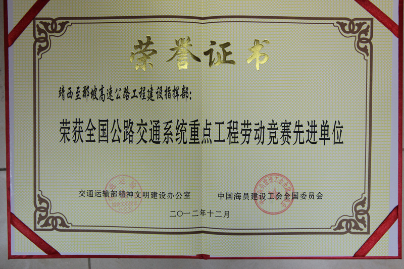 全国公路交通系统重点工程劳动竞赛先进单位荣誉证书(靖那路)