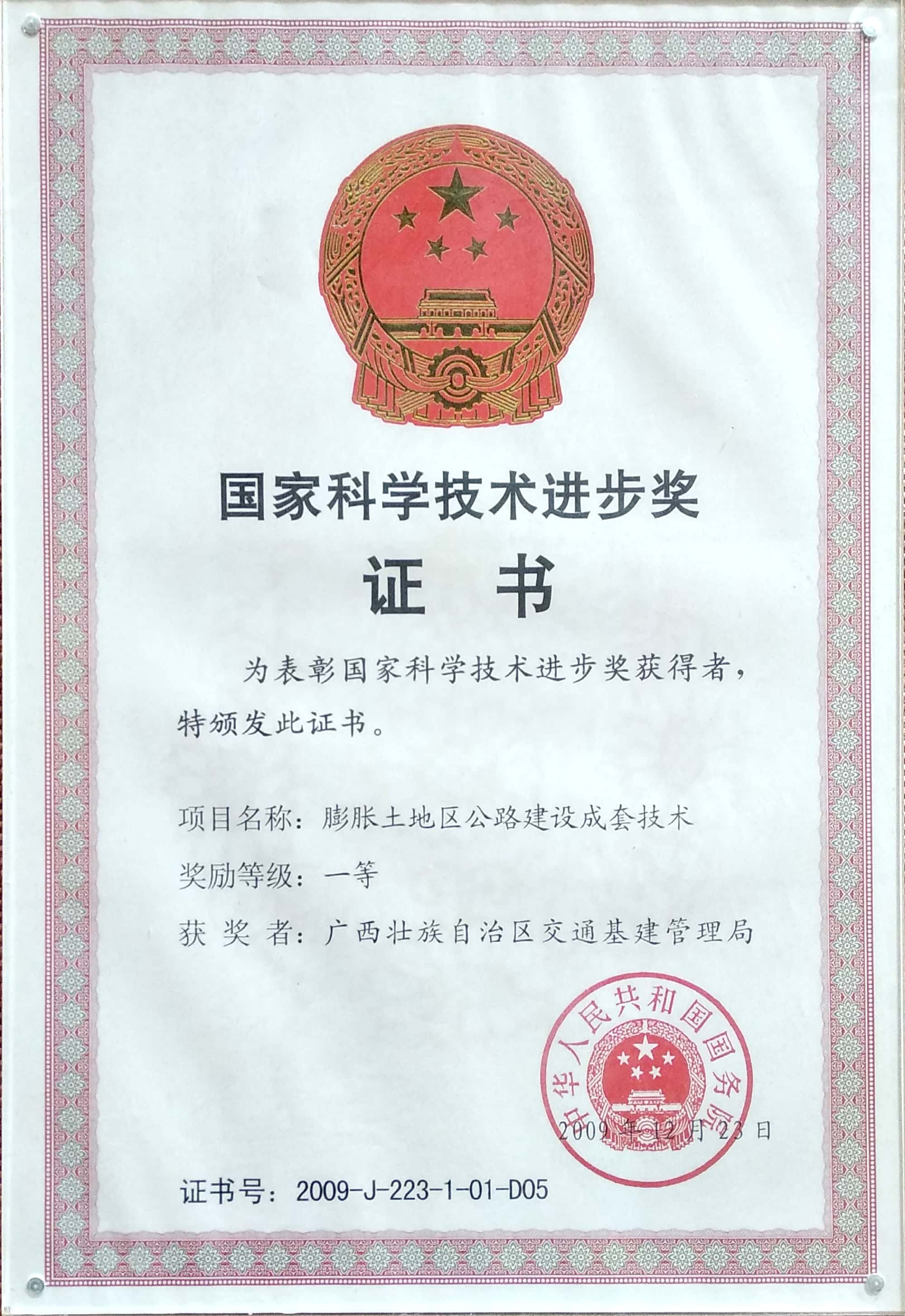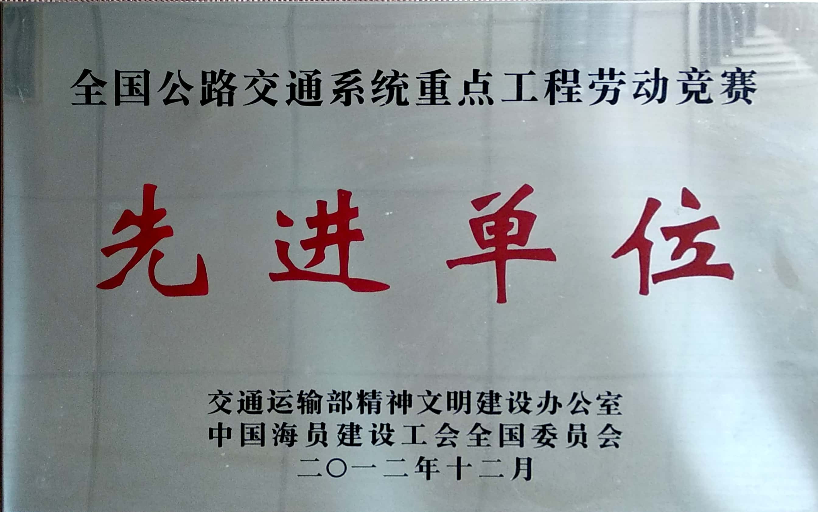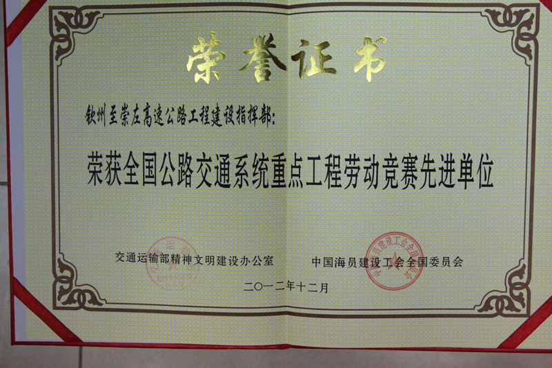全国公路交通系统重点工程劳动竞赛先进单位荣誉证书(钦崇路)