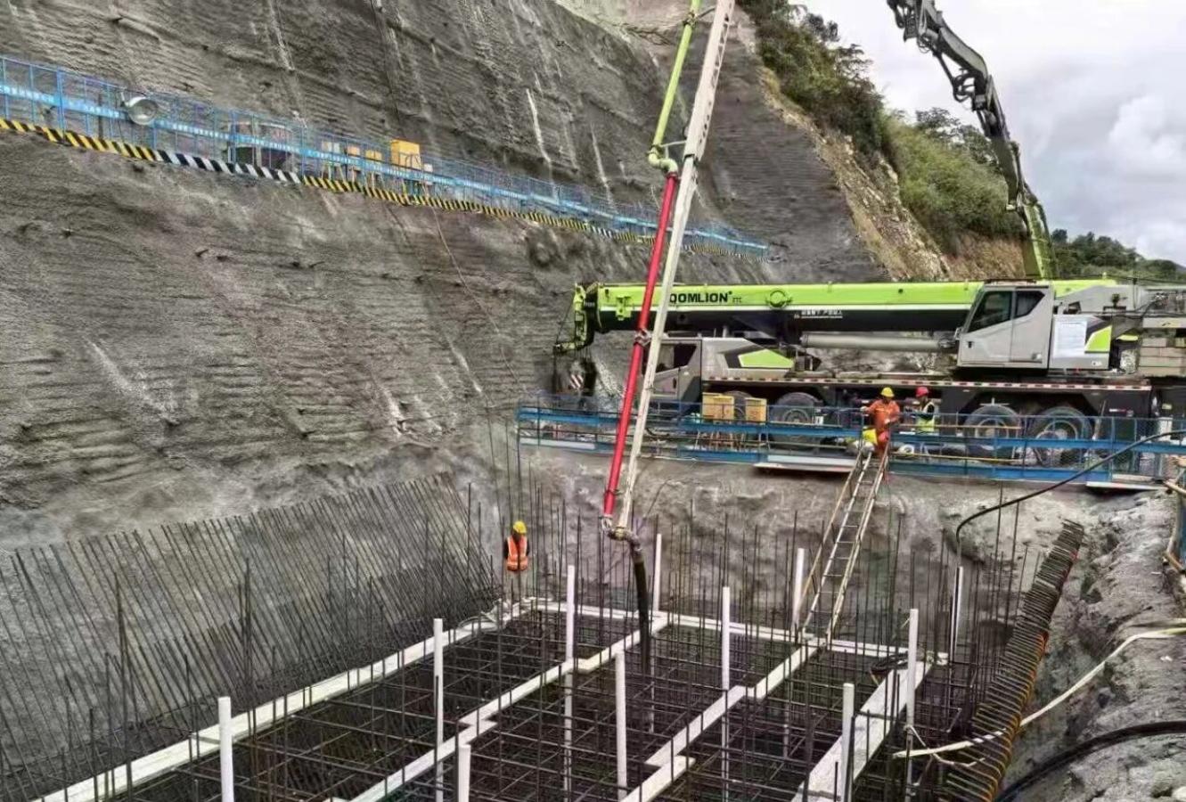 ▲正在进行浇筑的红水河特大桥贵州岸拱座