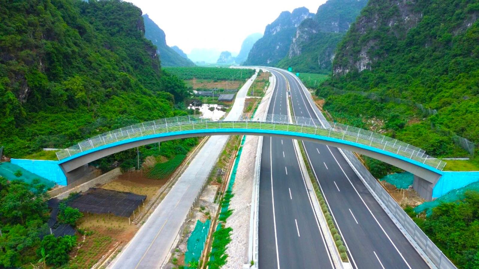 塑造路景相融“生态路”。大道蜿蜒接翠色,长桥飞渡惊碧霄。在项目施工过程中,推行隧道“零开挖”进洞、路面“零污染”施工、场站全封闭管理、路面拌和站天然气加热系统等节能环保措施,同时根据生态环保要求,针对黑叶猴保护区等环境敏感区域,设置灵长类动物通道,确保沿线生态环境不因项目实施遭到破坏,实现绿化全覆盖、动植物有效保护、生产无扬尘、河流零污染的效果。